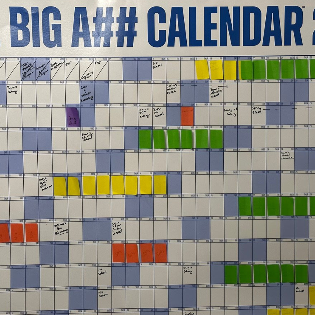 She sat in my office the other day, staring at the Big Ass Calendar I have on my wall. This calendar, designed by Jesse Itzler, allows you to view your entire year at once. It comes with multi-colored post-it notes for marking days dedicated to pursuing dreams, spending time with family, embarking on adventures, starting new habits, and more.